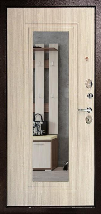 Прочный стальной каркас, лист металла толщиной 2 мм и система блокираторов делают эту модель надежным барьером для квартиры, офиса или частного дома. Внешняя поверхность покрыта молотковым напылением, устойчивым к механическим повреждениям и перепадам температуры, благодаря чему дверь сохраняет аккуратный вид долгие годы. Внутренняя накладка МДФ добавляет уюта и гармонично сочетается с интерьером прихожей. Зеркало на полотне выполняет не только декоративную функцию, но и делает пространство визуально шире. Зеленая входная дверь в квартиру №2 комплектуется двумя замками российских производителей — сувальдным Просам и цилиндровым Мосрентген, каждый из которых оснащён тремя ригелями. Два контура резинового уплотнения помогают минимизировать сквозняки и шум, а возможность выбрать сторону и тип открывания делает установку максимально удобной. При необходимости отделку, замки и дополнительные элементы можно адаптировать под индивидуальные требования. Зеленая входная дверь в квартиру №2 от производителя: быстрое изготовление и монтаж в Ивантеевке, индивидуальные размеры, широкий выбор материалов и фурнитуры, официальная гарантия до 10 лет.