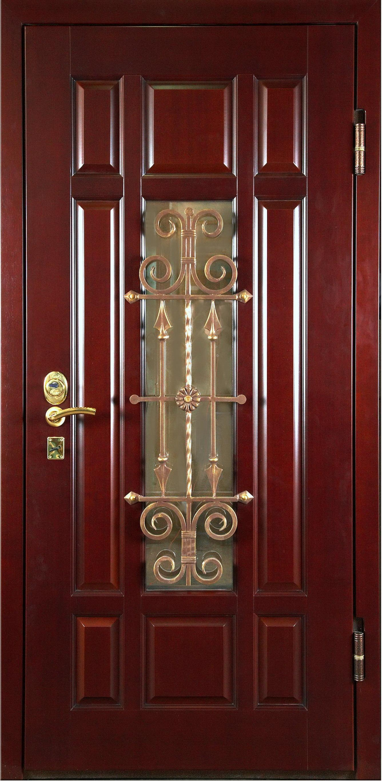 Дизайнерская входная дверь в частный дом с отделкой под дерево и решеткой №17